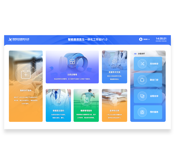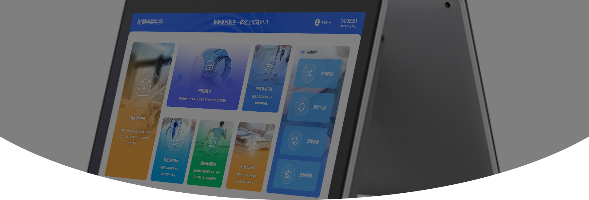 智能基層醫生一體機,集成基本醫療AI輔助臨床決策支持系統及健康管理智能輔助設備。簡化村衛生系統操作流程,指引規范醫治行為標準化,智能自動化公衛健康管理,在線查閱醫學知識庫深造學習,增進村醫與村民依靠關聯關系,讓百姓達到小病不出村、健康預防早知道。